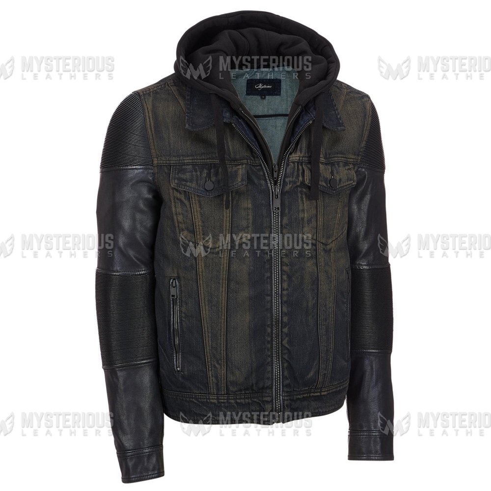 Mens Removable Fleece Hoodie Black Denim Jacket With Artificial Leather Sleeves